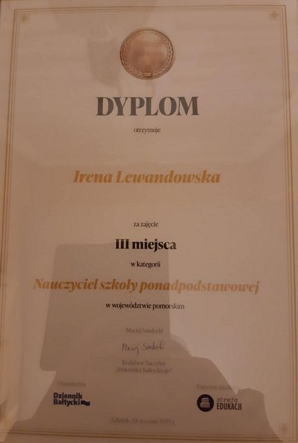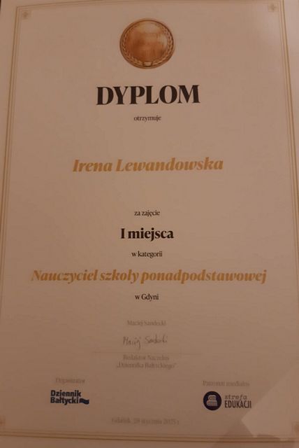 W środę 29 stycznia 2025 r. nasza nauczycielka, pani Irena Lewandowska, uczestniczyła w gali podsumowującej Plebiscyt Edukacyjny „Mistrzowie Edukacji 2024”, która odbyła się w Filharmonii Bałtyckiej w Gdańsku. Plebiscyt zorganizowany i prowadzony był przez „Dziennik Bałtycki”.
