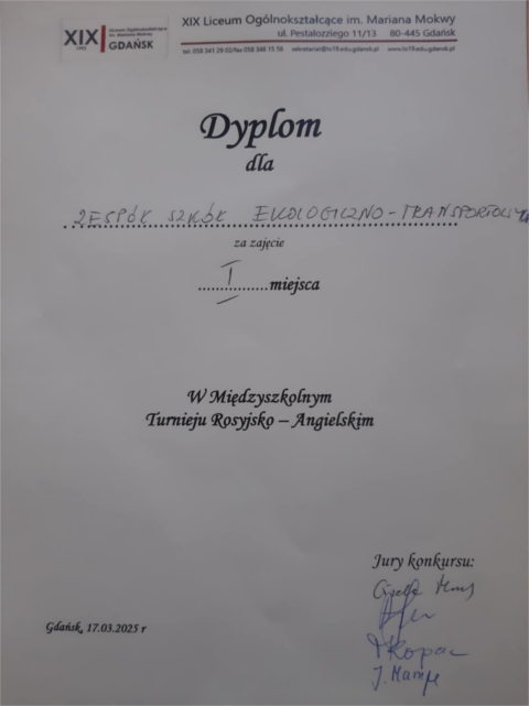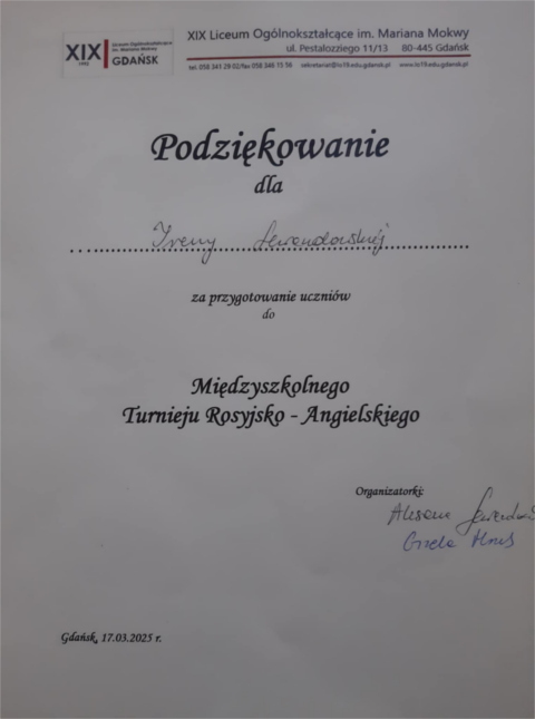 W poniedziałek 17 marca 2025 r. trzy uczennice z naszej szkoły: Maria Nalyvaiko z kl. II A oraz Ana Rogachova i Zoia Semykina z kl. III A wzięły udział w Międzyszkolnym Turnieju Rosyjsko-Angielskim, który odbył się w XIX LO w Gdańsku.