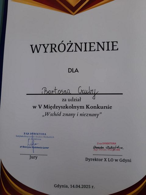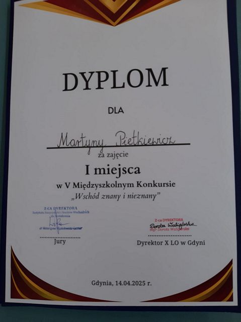 Pięcioro uczniów z kl. II A: Malwina Elas Necel, Paulina Langier, Łucja Leszczyńska, Martyna Pietkiewicz i Bartosz Czuba wzięło udział w V Międzyszkolnym Konkursie „Wschód znany i nieznany” zorganizowanym we współpracy X LO w Gdyni z Instytutem Rusycystyki i Studiów Wschodnich UG. W konkursie wzięło udział 30 uczniów z trójmiejskich szkół ponadpodstawowych, którzy przedstawili swoje prezentacje o krajach Wschodu. Nasi uczniowie przygotowali prezentacje o Chinach, Japonii i Korei Południowej.