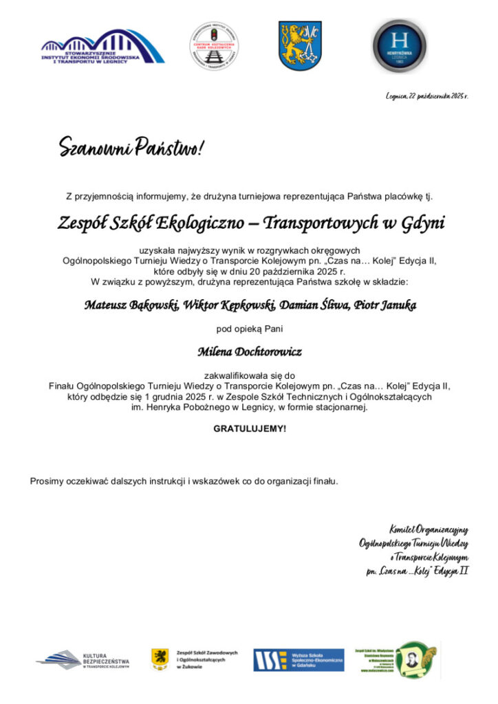 W poniedziałek 20 października 2025 r. odbyły się w naszej szkole eliminacje okręgowe w II Ogólnopolskim Turnieju Wiedzy o Transporcie Kolejowym „Czas na …Kolej”. W turnieju uczestniczyły 22 szkoły z całej Polski.