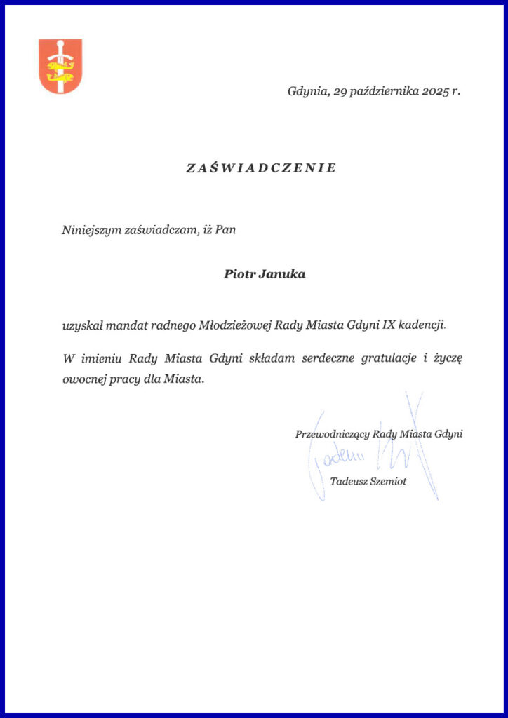 Z przyjemnością i dumą informujemy, że w środę 29 października 2025 r. nasz uczeń Piotr Januka z kl. 2 K/R został zaprzysiężony i oficjalnie rozpoczął pełnienie swojej funkcji w Młodzieżowej Radzie Miasta IX kadencji (2025-2027).