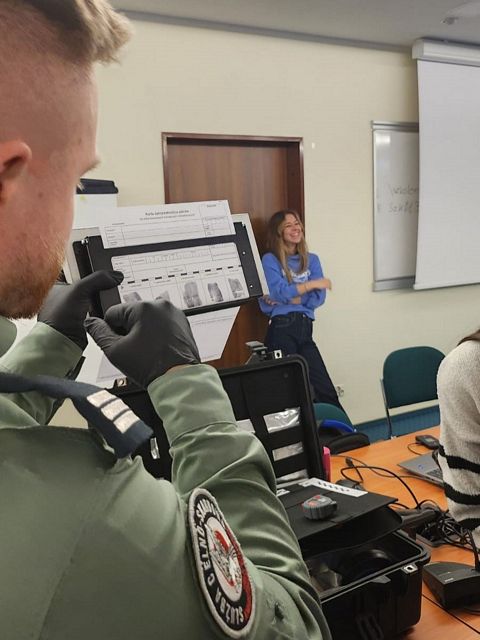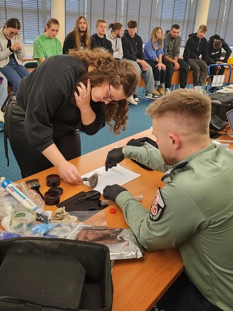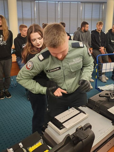 W czwartek 23 października 2025 r. klasa 5 S wraz z opiekunami – panią Beatą Kuźmińską i panem Zbigniewem Jędrzejczykiem – była w siedzibie Pomorskiego Urzędu Celno-Skarbowego w Gdyni. Funkcjonariusze zapoznali uczniów z technikami kryminalistycznymi i pozwolili im samym spróbować zdjąć odciski palców.